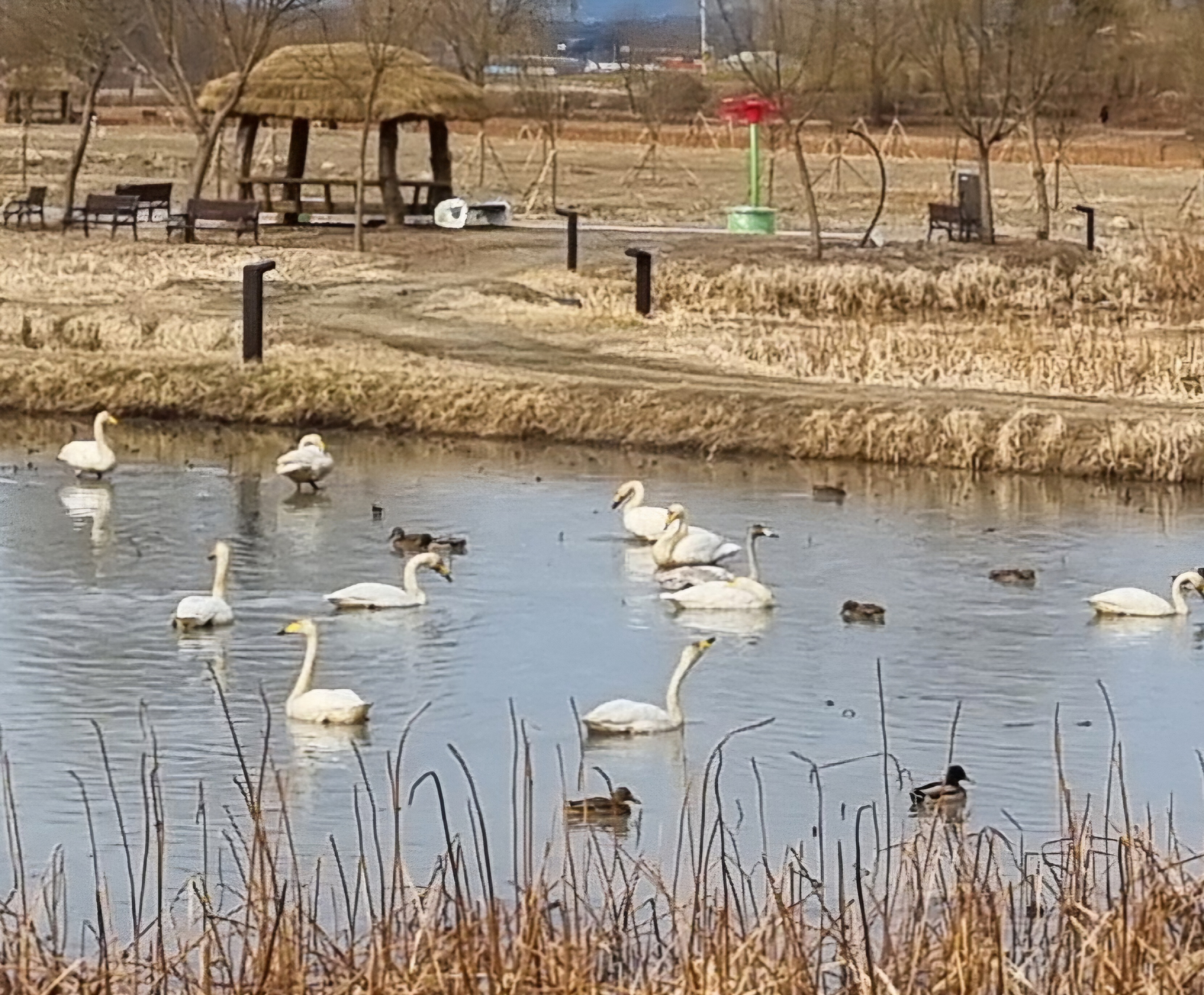 겨울철에는 오리와 고니가 자유롭게 노는 모습을 볼 수 있습니다.